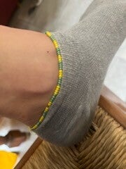 Découvrez notre magnifique bracelet de cheville en perles de polystyrène, une pièce unique et artisanale, que vous ne trouverez nulle part ailleurs. Fabriqué à la main avec soin, ce bracelet se distingue par son jeu de couleurs attrayantes, alliant des perles jaunes éclatantes à des nuances de vert foncé qui évoquent les belles journées d'été.